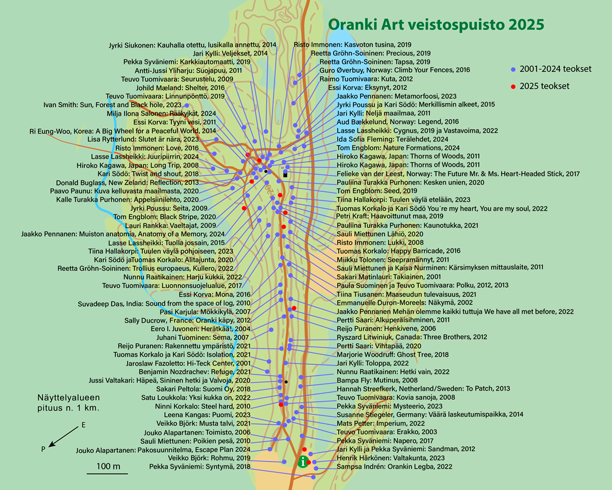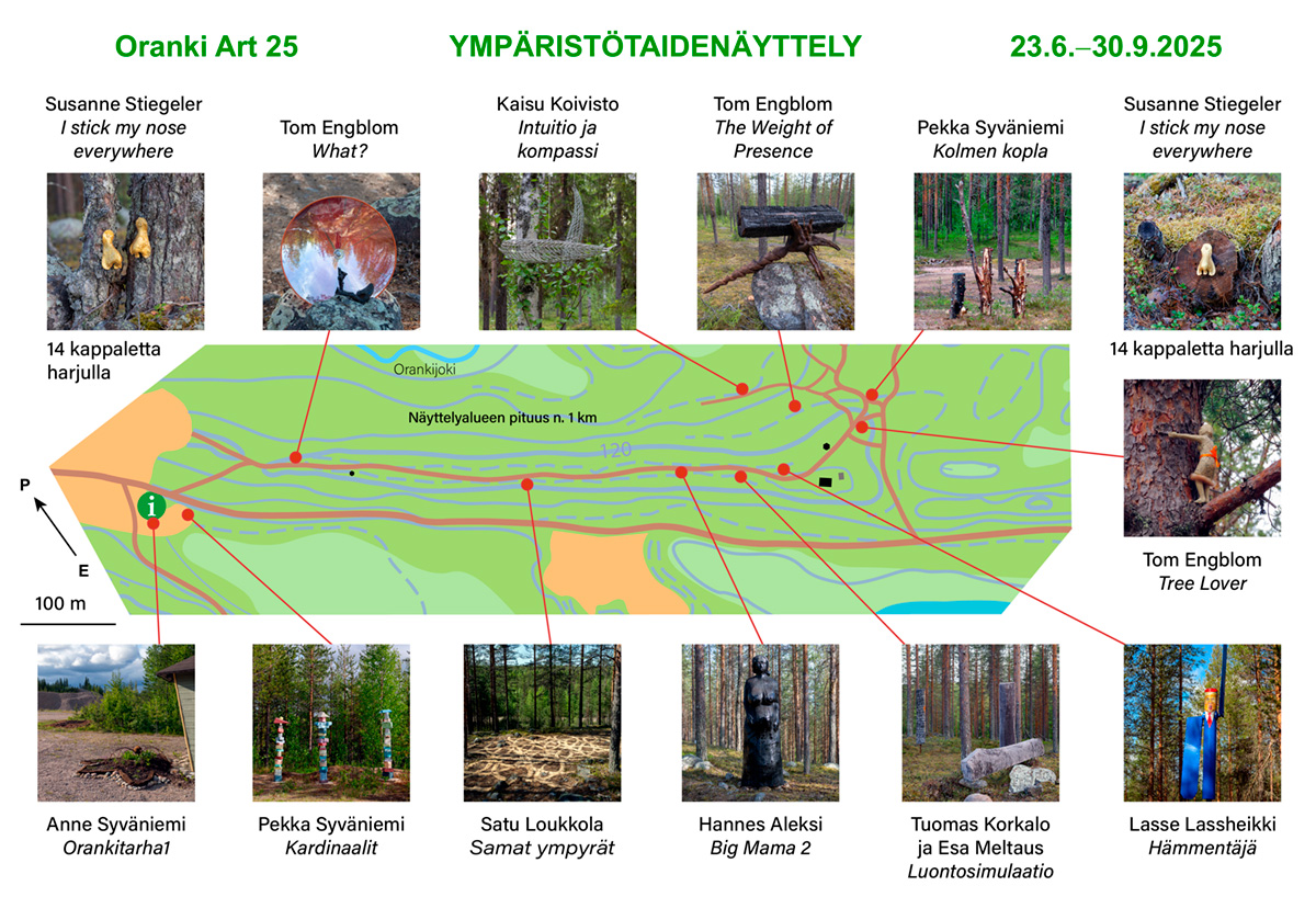 Lappi karttaVuonna 2025 Oranki Art ympäristötaidenäyttelyyn valmistui 12 uutta teosta kymmeneltä taiteilijalta